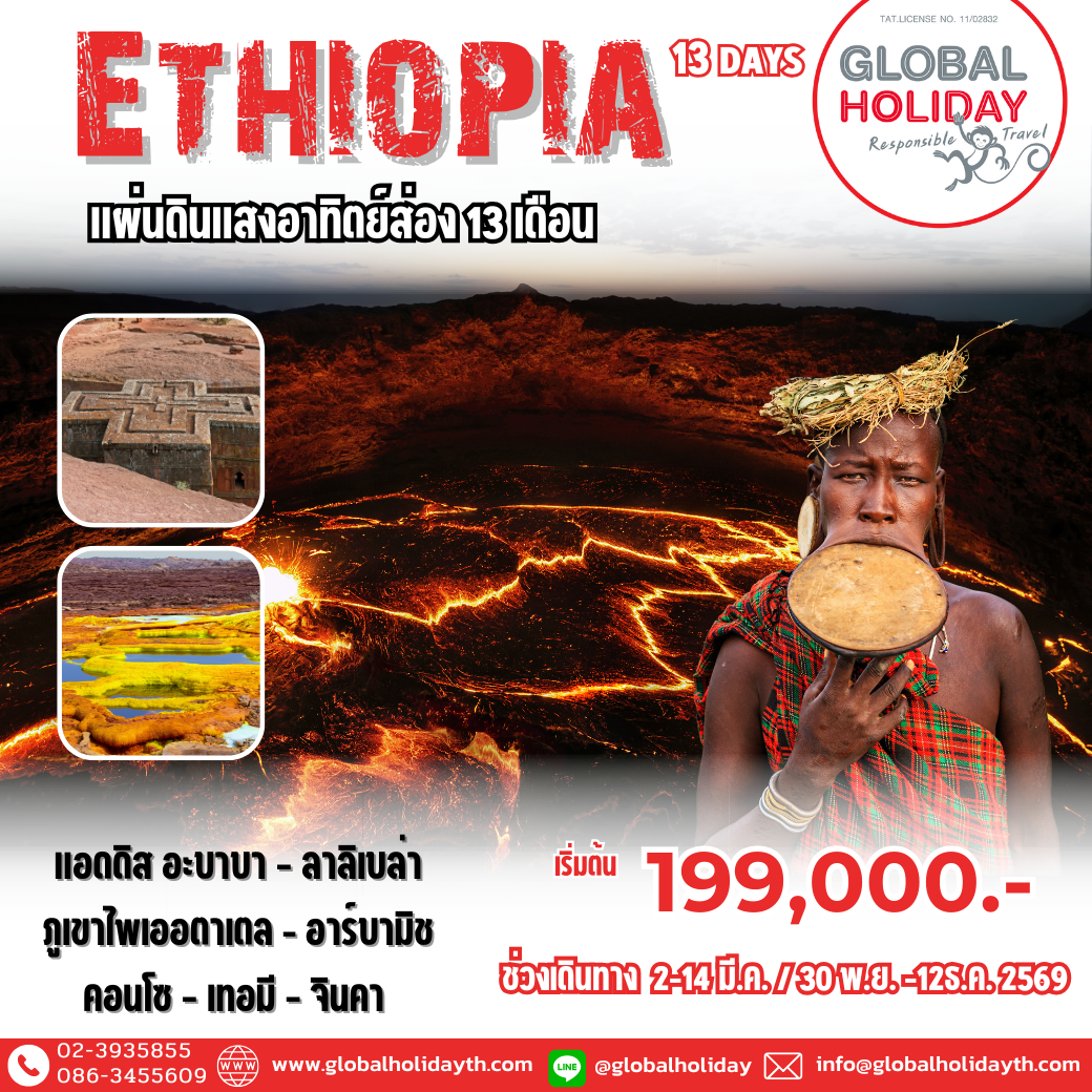 ทัวร์เอธิโอเปีย เจาะลึกอารยธรรมชนเผ่า ทัวร์เอธิโอเปีย 13 วันสุดคุ้ม ตามเส้นทางแอดดิส อะบาบา – ลาลิเบล่า – ดาลลอล – ภูเขาไฟเออตาเตล – อาร์บามิช - คอนโซ – เผ่าคอนโซ – เทอมี – ชนเผ่าลุ่มแม่น้าโอโม – จินคา – เผ่าเมอซี หรือ มูร์ซี