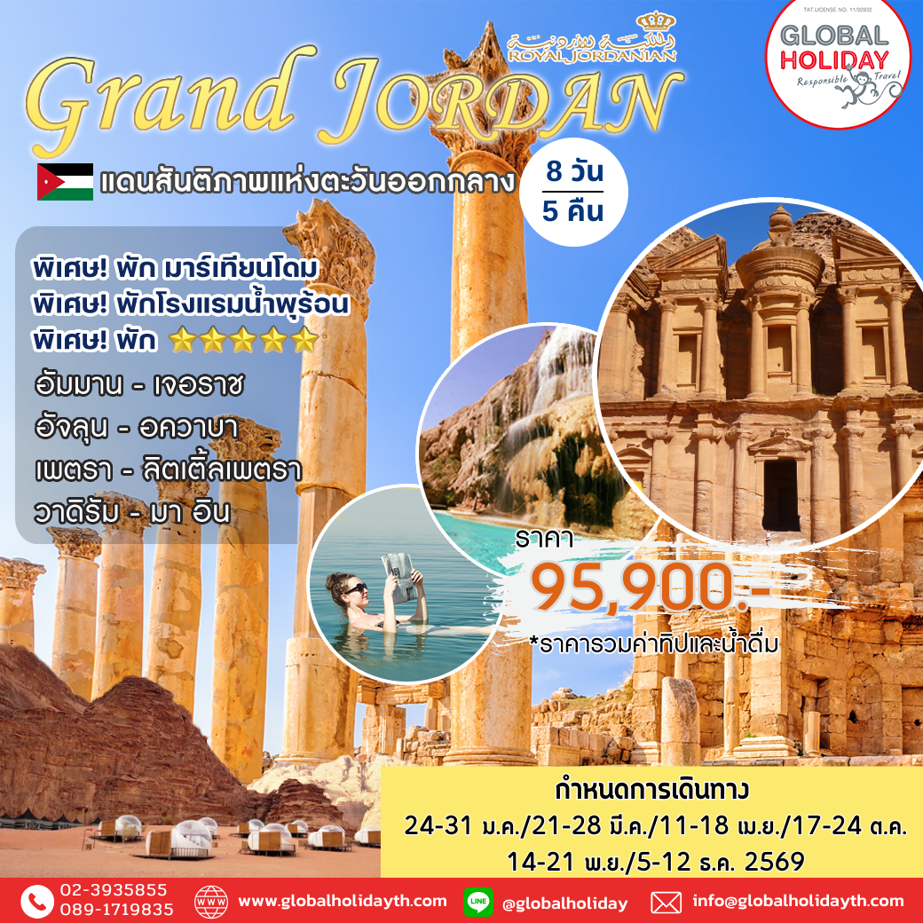 ทัวร์จอร์แดน...กลิ่นอายอารยธรรมโบราณเหนือกาลเวลาเป็นดั่งสมุดบันทึกประวัติศาสตร์ของโลกชิ้นเอกที่ทรงคุณค่า รื่นรมย์กับปราสาททรายมากมายตั้งอยู่เกลื่อน คิดตรองถึงกองคาราวานเดินทางไกลโพ้น ตามรอยของโมเสส ผู้แหวกทะเลแดงบนดินแดนแห่งศรัทธาและสันติ ลัดเลาะเมืองเก่าของชาวนาบาเทียน ณ มรดกโลกนครเพตรา...ศิลาทรายสีชมพู ดื่มด่ำความสุขรอบกองไฟคละเคล้าหมู่ดาวยามค่ำคืนท่ามกลางทะเลทรายสีชมพูแห่งวาดิรัม เก็บเกี่ยวประสบการณ์เชิดหน้าเงยคอลอยตัวในทะเลเดดซี ณ จุดที่ต่ำและเค็มที่สุดของโลก เที่ยวสนุกอย่างมีความหมาย คุ้มค่าทุกนาทีที่นี่ที่...จอร์แดน