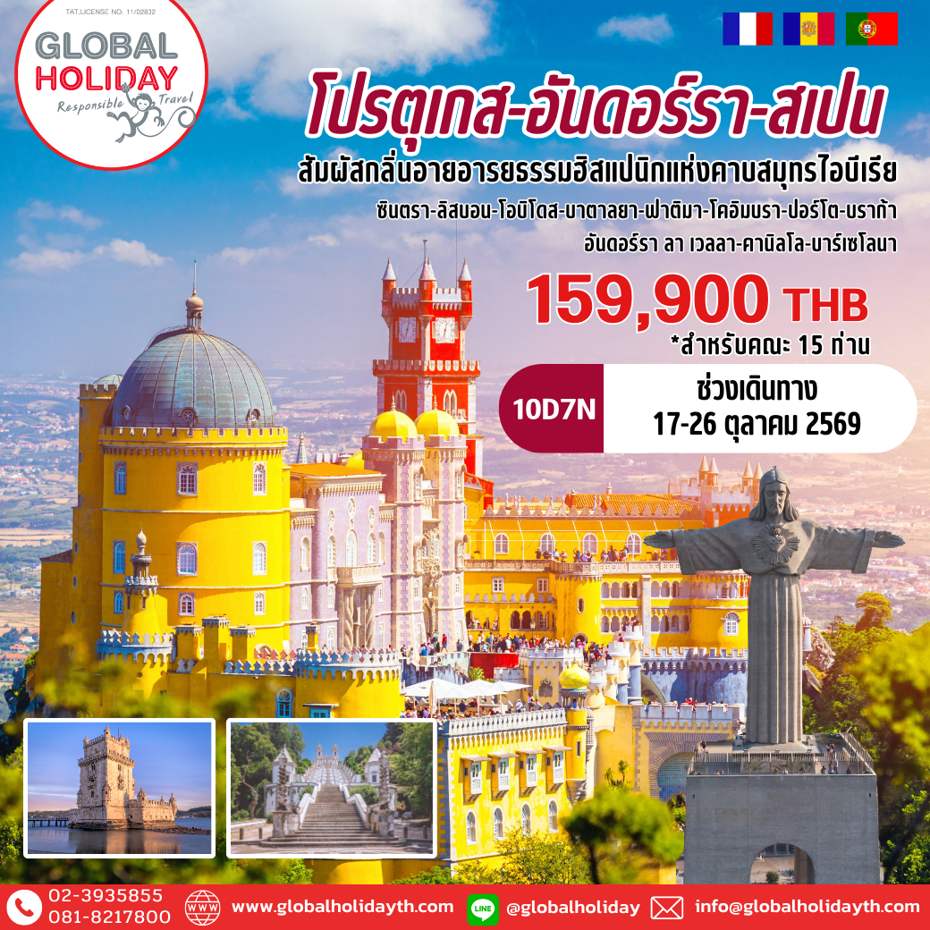 โกลบอล ฮอลิเดย์ ขอนำเสนอเส้นทางพิเศษบนคาบสมุทรไอบีเรีย เริ่มต้นทางจาก โปรตุเกส ซึ่งเป็นประเทศที่เก่าแก่มากชาติหนึ่งในยุโรปตั้งอยู่ทางด้านตะวันตกของคาบสมุทรไอบีเรีย โดยมีชนชาติต่างๆ อาทิ ไอบีเรีย โรมัน มุสลิม ผลัดเปลี่ยนเข้ามาตั้งรกรากและปกครอง ก่อนที่โปรตุเกสจะประกาศเป็นประเทศเอกราชในปี ค.ศ.1128 ภายใต้การปกครองของ Afonso Henriques เป็นกษัตริย์องค์แรกของโปรตุเกส โปรตุเกสในช่วงคริสต์ศตวรรษที่ 16 มีความเจริญรุ่งเรืองอย่างมากทั้งทางด้านการทหาร การค้าขาย และการขยายล่าอาณานิคม โดยเฉพาะอย่างยิ่งการเดินเรือที่ถือได้ว่าโปรตุเกสประสบความสำเร็จอย่างมาก เนื่องจากความได้เปรียบทางทำ เลที่ตั้ง ภูมิศาสตร์ และเทคโนโลยี ความก้าวหน้าและความชำนาญในการเดินเรือ ทำให้โปรตุเกสค้นพบเส้นทางเดินเรือใหม่ๆ ผู้มีชื่อเสียงด้านการเดินเรือและเป็นที่รู้จักอย่างดี คือ เจ้าชาย Henry the Navigator ผู้ค้นพบทวีปแอฟริกา และนาย Vasco da Gama ซึ่งเป็นผู้ค้นพบเส้นทางเดินเรือไปสู่ประเทศอินเดีย จากความเจริญรุ่งเรือง ด้านการเดินเรือส่งผลให้โปรตุเกสเป็นประเทศที่ยิ่งใหญ่ชาติหนึ่งและเป็นเจ้าอาณานิคมมากมายในทวีปแอฟริกา ละตินอเมริกา และเอเชีย... ก้าวข้ามสู่ อันดอร์รา ประเทศเล็กๆท่ามกลางขุนเขา ประเทศที่เล็กจิ๋วแต่แจ๋วเพราะเป็นเมืองปลอดภัยและปลอดภาษี โอโซนบริสุทธิ์... สิ้นสุดปลายทาง ณ บาร์เซโลนา เมืองสถาปัตยกรรมมรดกโลกแห่งสเปนสุดมหัศจรรย์