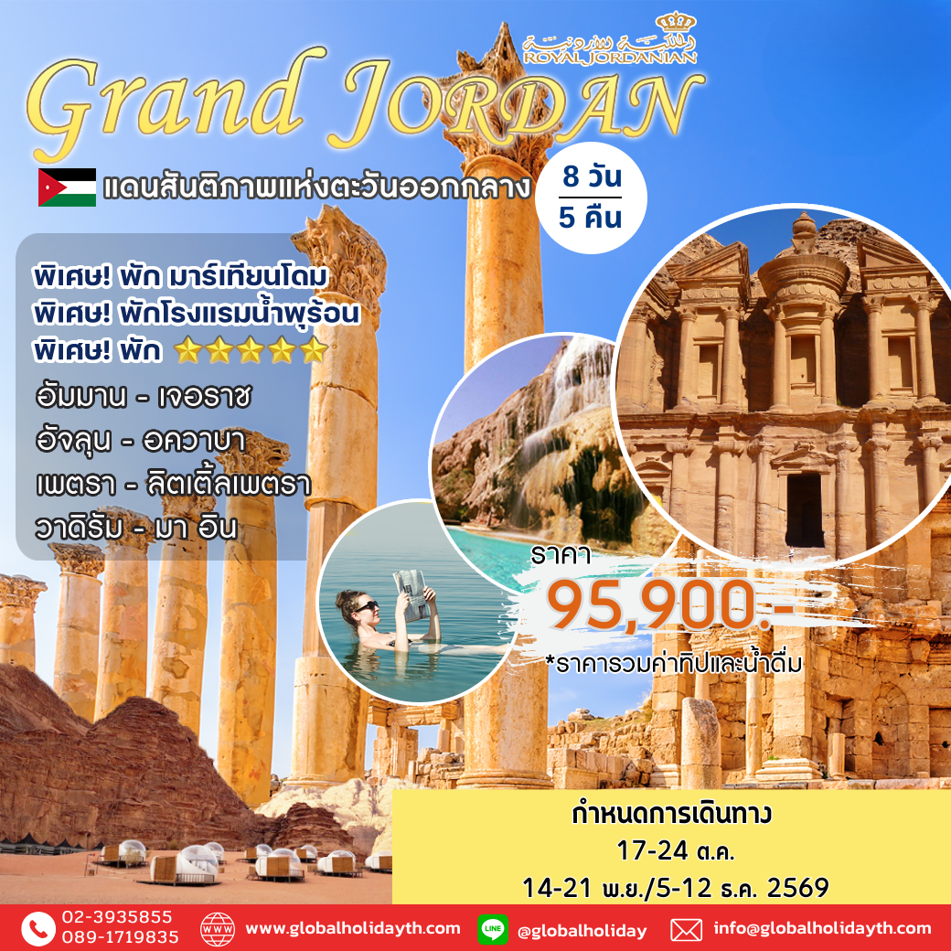 ทัวร์จอร์แดน...กลิ่นอายอารยธรรมโบราณเหนือกาลเวลาเป็นดั่งสมุดบันทึกประวัติศาสตร์ของโลกชิ้นเอกที่ทรงคุณค่า รื่นรมย์กับปราสาททรายมากมายตั้งอยู่เกลื่อน คิดตรองถึงกองคาราวานเดินทางไกลโพ้น ตามรอยของโมเสส ผู้แหวกทะเลแดงบนดินแดนแห่งศรัทธาและสันติ ลัดเลาะเมืองเก่าของชาวนาบาเทียน ณ มรดกโลกนครเพตรา...ศิลาทรายสีชมพู ดื่มด่ำความสุขรอบกองไฟคละเคล้าหมู่ดาวยามค่ำคืนท่ามกลางทะเลทรายสีชมพูแห่งวาดิรัม เก็บเกี่ยวประสบการณ์เชิดหน้าเงยคอลอยตัวในทะเลเดดซี ณ จุดที่ต่ำและเค็มที่สุดของโลก เที่ยวสนุกอย่างมีความหมาย คุ้มค่าทุกนาทีที่นี่ที่...จอร์แดน