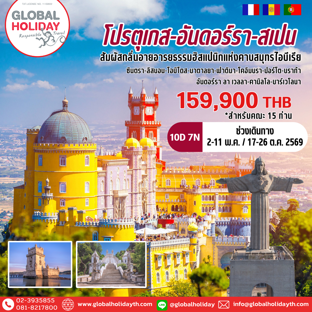 โกลบอล ฮอลิเดย์ ขอนำเสนอเส้นทางพิเศษบนคาบสมุทรไอบีเรีย เริ่มต้นทางจาก โปรตุเกส ซึ่งเป็นประเทศที่เก่าแก่มากชาติหนึ่งในยุโรปตั้งอยู่ทางด้านตะวันตกของคาบสมุทรไอบีเรีย โดยมีชนชาติต่างๆ อาทิ ไอบีเรีย โรมัน มุสลิม ผลัดเปลี่ยนเข้ามาตั้งรกรากและปกครอง ก่อนที่โปรตุเกสจะประกาศเป็นประเทศเอกราชในปี ค.ศ.1128 ภายใต้การปกครองของ Afonso Henriques เป็นกษัตริย์องค์แรกของโปรตุเกส โปรตุเกสในช่วงคริสต์ศตวรรษที่ 16 มีความเจริญรุ่งเรืองอย่างมากทั้งทางด้านการทหาร การค้าขาย และการขยายล่าอาณานิคม โดยเฉพาะอย่างยิ่งการเดินเรือที่ถือได้ว่าโปรตุเกสประสบความสำเร็จอย่างมาก เนื่องจากความได้เปรียบทางทำ เลที่ตั้ง ภูมิศาสตร์ และเทคโนโลยี ความก้าวหน้าและความชำนาญในการเดินเรือ ทำให้โปรตุเกสค้นพบเส้นทางเดินเรือใหม่ๆ ผู้มีชื่อเสียงด้านการเดินเรือและเป็นที่รู้จักอย่างดี คือ เจ้าชาย Henry the Navigator ผู้ค้นพบทวีปแอฟริกา และนาย Vasco da Gama ซึ่งเป็นผู้ค้นพบเส้นทางเดินเรือไปสู่ประเทศอินเดีย จากความเจริญรุ่งเรือง ด้านการเดินเรือส่งผลให้โปรตุเกสเป็นประเทศที่ยิ่งใหญ่ชาติหนึ่งและเป็นเจ้าอาณานิคมมากมายในทวีปแอฟริกา ละตินอเมริกา และเอเชีย... ก้าวข้ามสู่ อันดอร์รา ประเทศเล็กๆท่ามกลางขุนเขา ประเทศที่เล็กจิ๋วแต่แจ๋วเพราะเป็นเมืองปลอดภัยและปลอดภาษี โอโซนบริสุทธิ์... สิ้นสุดปลายทาง ณ บาร์เซโลนา เมืองสถาปัตยกรรมมรดกโลกแห่งสเปนสุดมหัศจรรย์