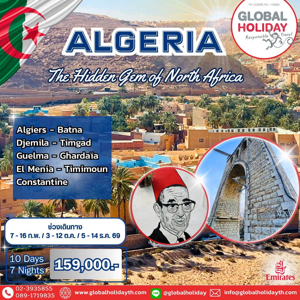 ทัวร์แอลจีเรีย อัญมณีสุดล้ำค่าแห่งแอฟริกาเหนือ ดินแดนแห่งธรรมชาติและวัฒนธรรมอันสุดลึกซึ้ง นำท่านเที่ยวประเทศที่ใหญ่ที่สุดในแอฟริกา เที่ยวกับ ทัวร์ แอลจีเรีย เต็มไปด้วยเสน่ห์ของทะเลทรายซาฮาร่า เมืองโบราณ และชายฝั่งเมดิเตอร์เรเนียนที่สวยงาม ไม่ว่าจะเป็นการสำรวจโอเอซิสกลางทะเลทราย ชมสถาปัตยกรรมโรมันโบราณ และสัมผัสวัฒนธรรมพื้นเมืองของชาวเบอร์เบอร์