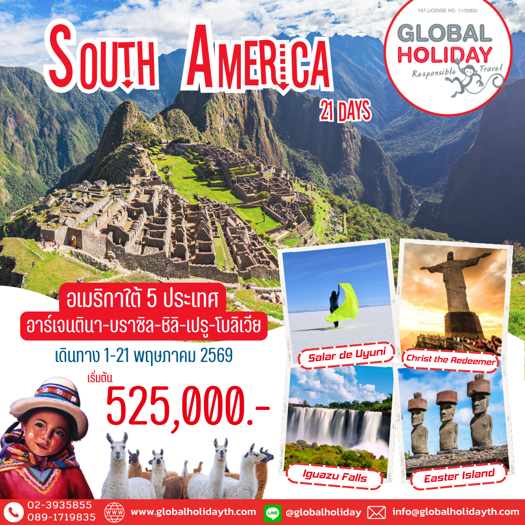โกลบอล ฮอลิเดย์ ขอนำเสนอโปรแกรมสุดยอดการเยือน ลาตินอเมริกา 5 ประเทศ เดินทางครั้งเดียว เที่ยวครบ ไม่เสียเวลา หากท่านเป็นผู้ใฝ่ฝันสู่การเดินทางอันแสนไกลสู่อีกฟากฝั่งของโลก อเมริกาใต้ เยือนประเทศเปรู มาชูปิกชู ความลึกลับของนครที่สาบสูญของอาณาจักรอินคา สู่ประเทศชิลี เรานำท่านสำรวจดินแดนอันไกลโพ้นที่ เกาะอีสเตอร์ สถานที่ที่โดดเดี่ยวกลางมหาสมุทรแปซิฟิก น้อยคนนักที่จะเคยเดินทางมาเยือน ร่วมค้นหาที่มาของรูปสลักหินที่ตั้งอยู่ทั่วเกาะ หรือ โมอาย มีที่มาอย่างไร เยือนประเทศโบลิเวีย ทะเลสาบเกลืออูยูนี (Uyuni) เป็นทะเลสาบน้ำเค็ม หรือ ทะเลสาบแห้ง (salt flat หรือ dry lake) ที่ใหญ่ที่สุดในโลกตั้งอยู่สูงจากระดับน้าทะเล 3,600 เมตร และเยือนประเทศบราซิลและอาร์เจนตินา ชม น้ำตกอิกวาซู น้ำตกที่มีความงดงามที่สุดแห่งหนึ่งในอเมริกาใต้ชมทั้งสองฝั่ง พร้อมกับกิจกรรม ล่องเรือผจญภัยกับน้ำตกที่ยิ่งใหญ่